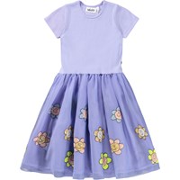 Lila klänning med korta ärmar och en tyllkjol med glada paljettblommor. Toppen har en åtsittande passform i mjuk, ribbad bomullsjersey med en rund halsringning. Kjolen är knälång och fodrad med en bekväm bomullsunderkjol för extra komfort.