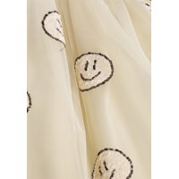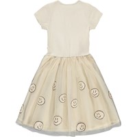 Offwhite klänning med korta ärmar och en tyllkjol med glada paljettansikten. Toppen har en åtsittande passform i mjuk, ribbad bomullsjersey med en rund halsringning. Kjolen är knälång och fodrad med en bekväm bomullsunderkjol för extra komfort.