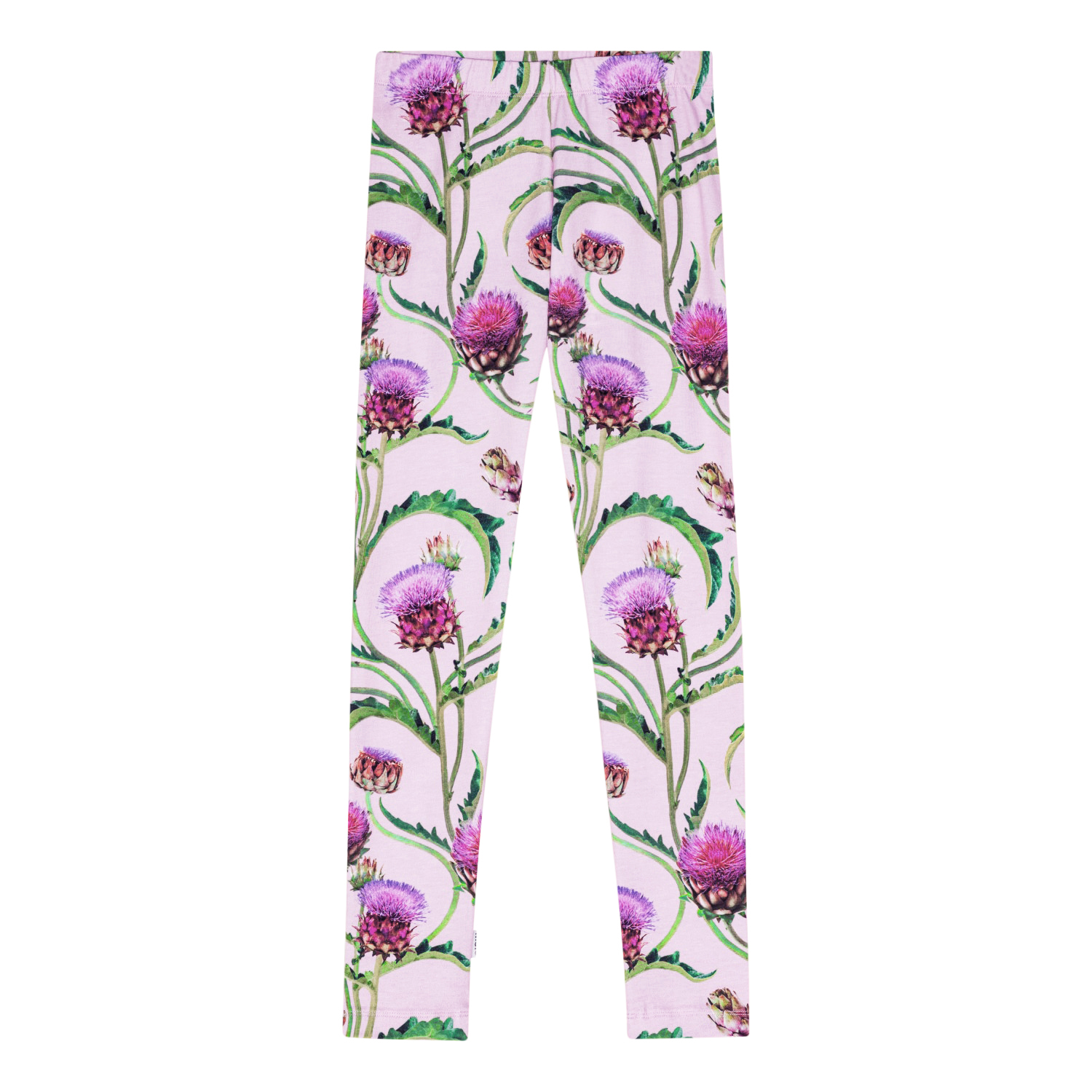 Rosa leggings i elastisk mjuk viskos. De är tighta, enkla att ta av och på och sköna att ha på. Leggingsen har ett multifärgat mönster med kronärtskocksblommor i röda, lila och gröna nyanser.