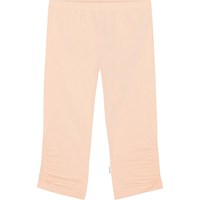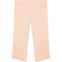 Korta puderfärgade leggings i ekologisk bomull. Byxorna går till knäet med en liten rynka på sidan. De är tighta, har gumiband i midjan som gör dem enkla att ta av och på och sköna att ha på.