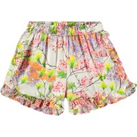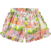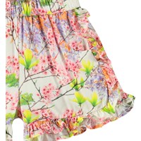 Viskosshorts med två sidofickor och lös passform. Shortsen har breda volangkanter längs sidorna och nertill och ett mönster av blommande träd.