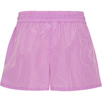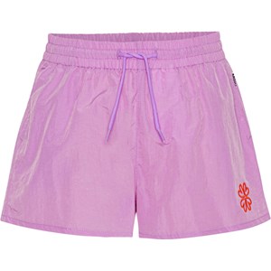 Lila sportiga nylonshorts. Shortsen har ett vitt broderat klövermärke, sidofickor, bred midja med gummiband och snören som gör dem enkla att ta av pch på, samt sköna att ha på. Shortsen är lämpliga för att bli blöta då den tunna nylonen torkar fort.