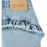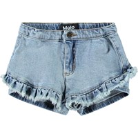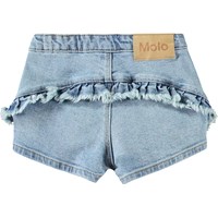 Blå jeansshorts i ekologisk bomull. Dessa shorts har volangdetaljer fram och bak, en bra passform, knapp och dragkedja, och kan justeras med en invändig knapp i midjan. Shortsen har en rå volangkant fram som fortsätter hela vägen runt till baksidan.