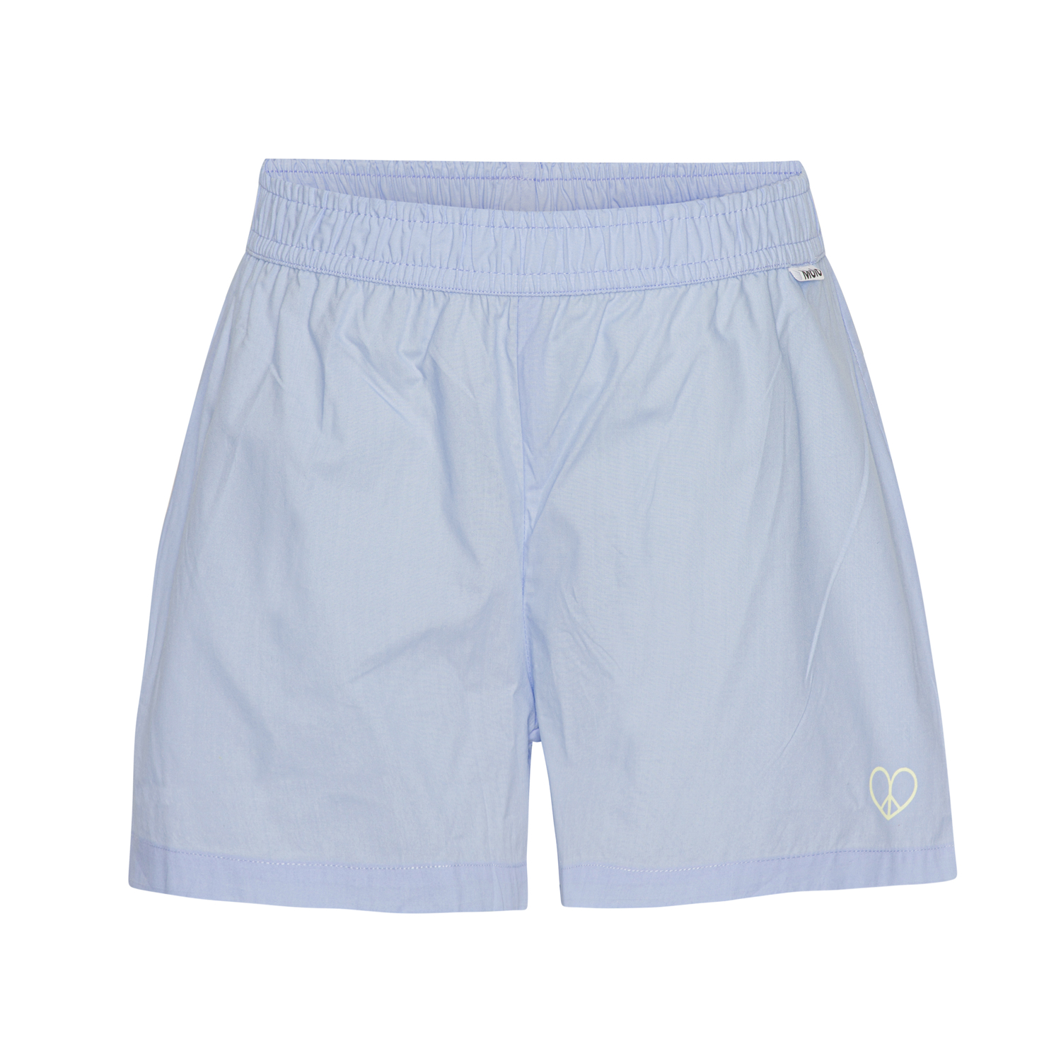 Air är ett par ljusblå shorts i ekologisk bomull. Shortsen har gummiband i midjan och ett litet peacetecken som formar ett hjärta på låret.