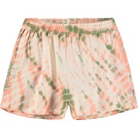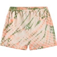 Rosa och gröna shorts i ekologisk bomull med flerfärgat batikmönster. Dessa shorts har en lös passform, en bakficka och en elastisk midja. All vår batik är handgjord vilket skapar ett unikt mönster som varierar från plagg till plagg.