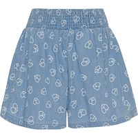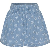 Alanis är ett par ljusblå shorts med breda ben pch små ljusa peacetecken som formar hjärtan. I midjan är det ett brett gummiband, vilket ger shortsen en skön passform.