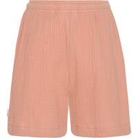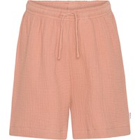 Albertha är ett par shorts i rosa muslin med ljusblå smileys. Shortsen har både gummiband och knytband i midjan.
