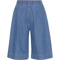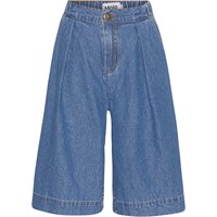 Blå, knälpnga och breda jeansshorts med veck framtill och gummiband bak i midjan. Shortsen har fickor framtill och stängs med knapp och dragkedja. Huvuddelen av detta plagg är tillverkad i ekologisk bomull.
