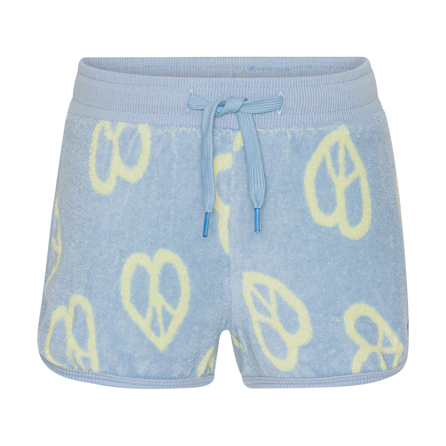 Alyia är ett par korta, ljusblå frotté shorts med peacetecken formade som hjärtan. Aliya har gummiband i midjan med knytband, för en skön passform.