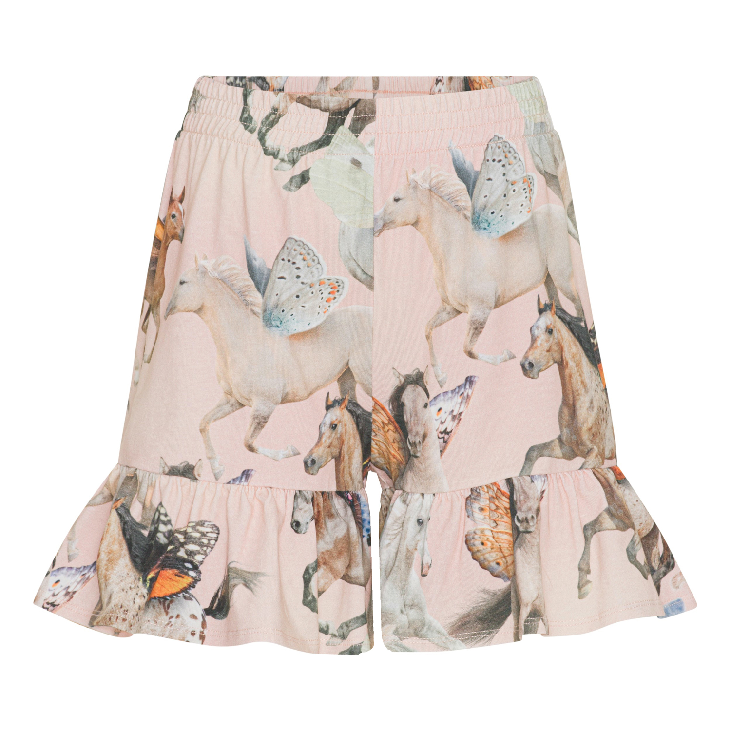 Almira är ett par shorts med breda volanger i botten. Shortsen har gummiband i midjan och galoppernade hästar med fjärilsvingar.