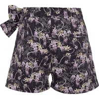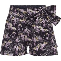 Alysse är ett par mörka shorts med blommor. Shortsen har gummiband i midjan med en stor pyntrosett i sidan.