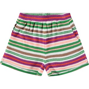 Shorts i mjuk bomullsfrotté med ränder i lila, grön, rosa, brun och vit. Shortsen har en lös passform, sidofickor och en bred midjeresår som gör dem lätta att ta på och bekväma att bära. Bomullsfrotté är skönt att bära och torkar snabbt.