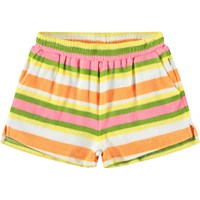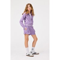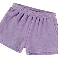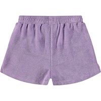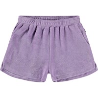 Lila shorts i mjuk bomullsfrotté. Shortsen har en lös passform, sidofickor och en bred midjeresår som gör dem lätta att ta på och bekväma att bära. Bomullsfrotté är skönt att bära och torkar snabbt.