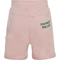 Ara är ett par mjuka rosa shorts med stora framfickor och 'One world, one love' broderat på baksidan. Shortsen är uppvikta i benen och har en elastisk midja.