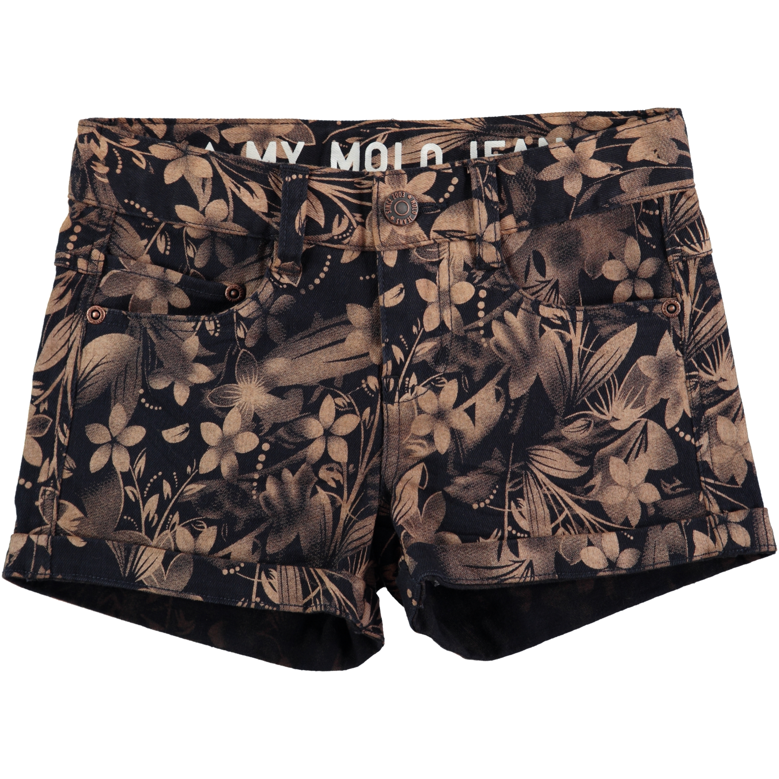Korta, mörkblå denim shorts med blommigt tryck och en skinny fit. Shortsen har reglerbar, resår i midjan med knapp, bältehällor och läder patch, fickor fram och bak samt uppvik nedtill. Observera, att storlekarna till och med 128 har tryckknapp, varav storlekarna från 134 och upp efter har vanlig jeansknapp.