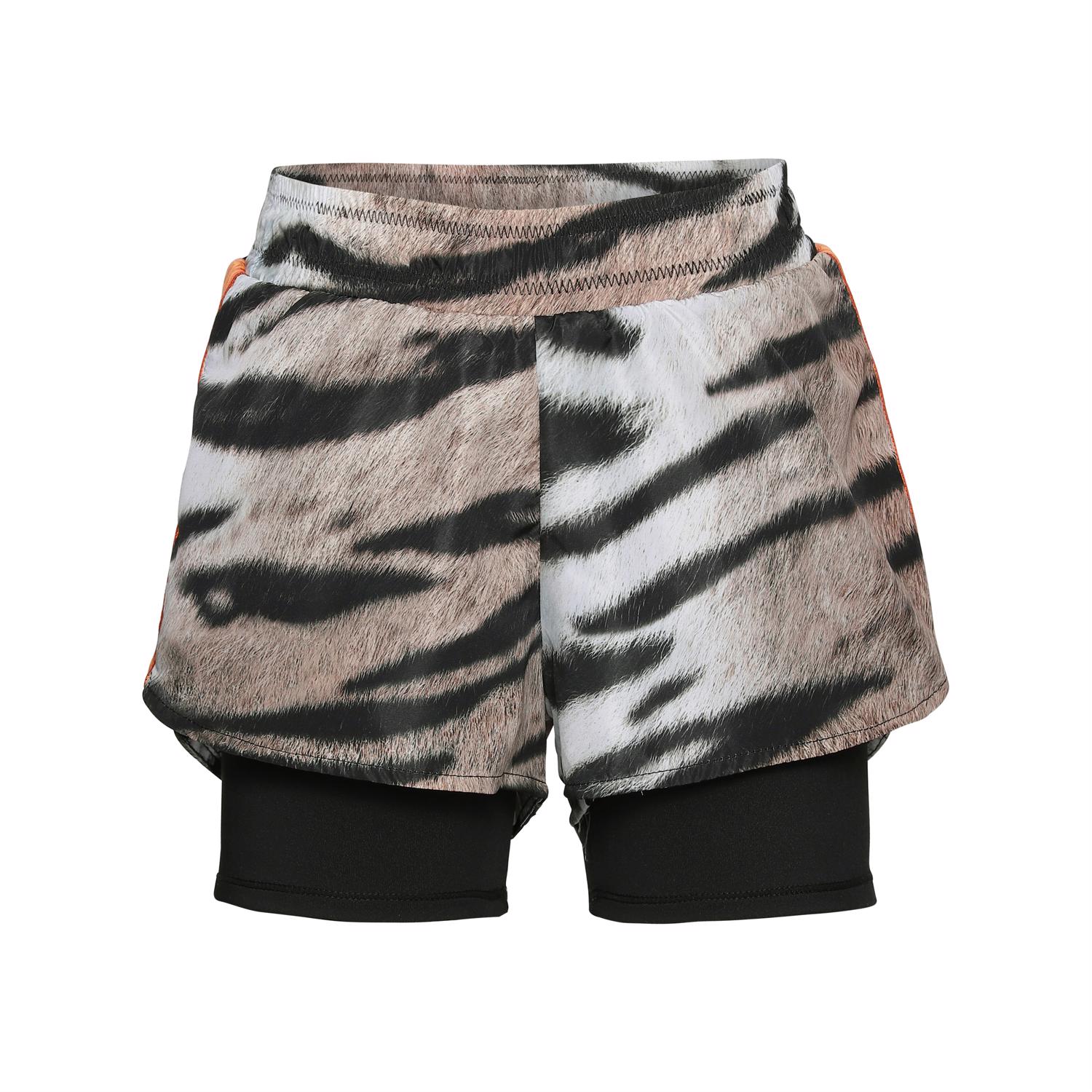 Omari är ett par sportshorts med två lager, där det yttre lagret är tigermönstrat, medan de innersta lagret är svart. Omari är bekväma och enkla att röra sig i. Dessa shorts är en del av Molos sportkollektion, som sammanför mode och sport. Kombinera Omari med en av Molos toppar för att göra din look komplett. Molos sportkollektion är framställt med en unik högteknologi kallad HeiQ Smart Temp, som stöder kroppens naturliga kylning. Kylfunktionen aktiveras när du är varm och svettig. Kylfunktionen inaktiveras när kroppen har svalnat. HeiQ Smart Temp garanterar optimal komfort och prestanda. Testat självständigt som säkert för huden.
