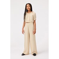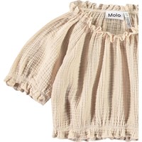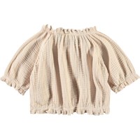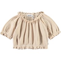 Beige kortärmad t-shirt i mjuk ekologisk våffelbomull. T-shirten har en rund hals med resår, samt resår i ärmarna och nederkanten, vilket skapar en lös effekt och gör den bekväm att bära. Matcha med matchande byxor för en komplett uppsättning.