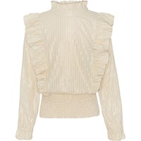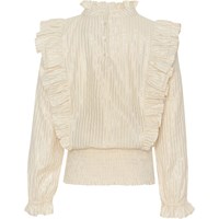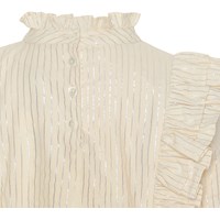 Rama är en beige skjorta med smala silvriga ränder. Skjortan har en liten krage och volangkanter både fram och bak.