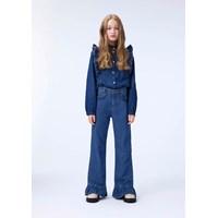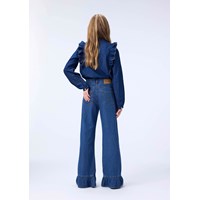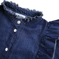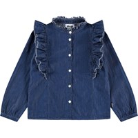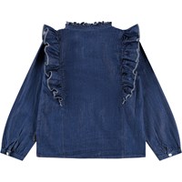 Långärmad lös jeansskjorta i ekologisk bomull. Skjortan har en mandarinkrage med en liten volangkant, små knappar i pärlemor och en elegant volangkant vid axlarna som sträcker sig både framåt och runt baksidan. Ärmarna har en liten manschett och knäpps med knappar.
