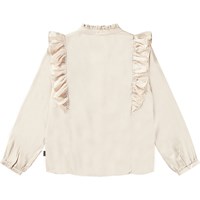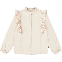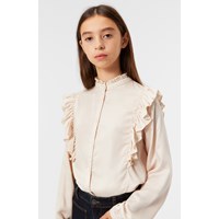 Puderfärgad långärmad löst sittande skjorta i mjuk och lätt viskos. Skjortan har en mandarinkrage med en liten rynkad kant, små knappar av pärlemor framtill och en elegant rynkad kant vid axlarna som sträcker sig ner längs framsidan och runt baksidan. Ärmarna har en liten manschett med ett sprund och knappar framtill.