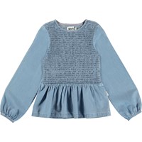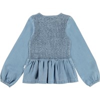 Rivi är en ljusblå jeansblus med smock effekt. Tröjan har lätt visa ärmar och fin peplumnederdel.
