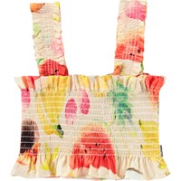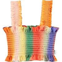 Regnbågsfärgad kort topp i ekologisk bomull med smock-effekt, volangkant och breda axelband. Kombinera toppen med matchande byxor för en komplett uppsättning.