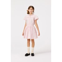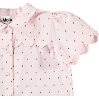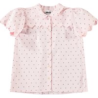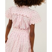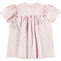 Lös skjorta i mjuk ekologisk bomull. Skjortan har en knappstängning framtill, en elegant krage, puffärmar med rynkningar och ett ok på baksidan med samma vågeffekt och rynkningar. Skjortan är rosa med finvävda svarta prickar i tyget. Kombinera den med en matchande kjol för en komplett uppsättning.
