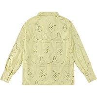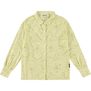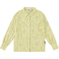 Dammig grön skjorta i ekologisk bomull med broderi anglaise. Skjortan har långa ärmar med två manchettknappar, skjortkrage och knappar framtill. Skjortan är löst sittande och fin sammansatt med kjolen i samma material och färg.