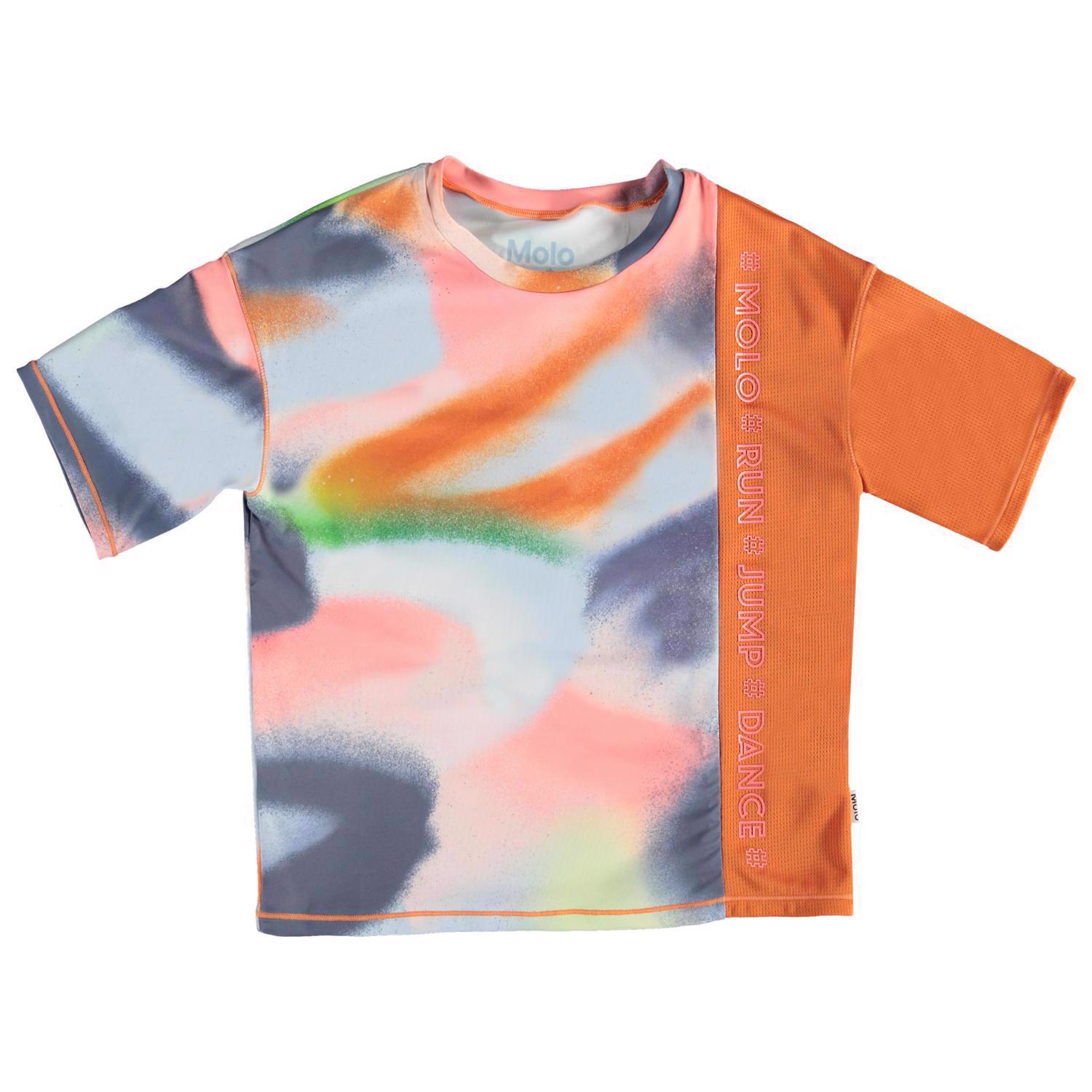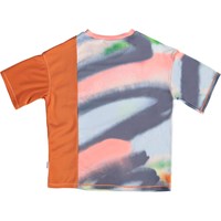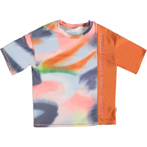 Odessa är en färgrik t-shirt med spraymönster samt orange panel med rosa sporttext. Tröjan har en skön och bred passform. Odessa är en del av Molo´s sportkollektion som binder samman mode och sport. T-shirten är skön att ha på och tillverkad i tekniska material vilket gör den perfekt båda när intensiteten är hög och när man bara vill slappna av. Molo´s sportkollektion är tillverkad med en unik high-performance teknologi kallad HeiQ Smart Temp, som stödjer kroppens naturliga nerkylning. Kylfunktionen aktiveras när du är varm och svettig och deaktiveras när kroppen är nerkyld. HeiQ Smart Temp säkrar optimal komfort och prestanda. Testat oberoende som säkerhet för huden.