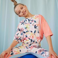 Odessa är en rosa och korallröd t-shirt med blommigt mönster samt korallröd panel med ljusblå sporttext. Tröjan har en skön och bred passform. Odessa är en del av Molo´s sportkollektion som binder samman mode och sport. T-shirten är skön att ha på och tillverkad i tekniska material vilket gör den perfekt båda när intensiteten är hög och när man bara vill slappna av. Molo´s sportkollektion är tillverkad med en unik high-performance teknologi kallad HeiQ Smart Temp, som stödjer kroppens naturliga nerkylning. Kylfunktionen aktiveras när du är varm och svettig och deaktiveras när kroppen är nerkyld. HeiQ Smart Temp säkrar optimal komfort och prestanda. Testat oberoende som säkerhet för huden.