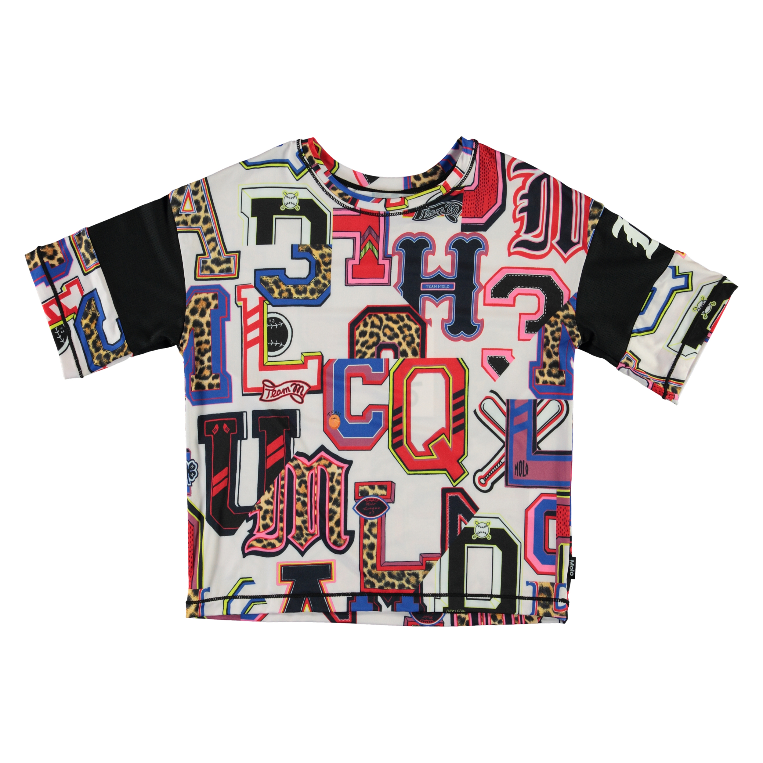 Odessa är en t-shirt med tryck av grafiska bokstäver och har en skön och lös passform. T-shirten har en bred svart rand på båda ärmarna. T-shirten är en del av Molo's sportskollektion, som kombinerar mode och sport. T-shirten är skön och är tillverkad av tekniska material som kan användas både när intensiteten är hög eller bara för att koppla av. Molo’s sportskollektion är tillverkad med en unik högpresterande teknologi som heter HeiQ Smart Temp, som stöder kroppens naturliga avkylning. Kylfunktionen aktiveras när du är varm och svettig. Kylfunktionen inaktiveras när kroppen är avkyld. HeiQ Smart Temp garanterar optimal komfort och prestanda. Testad oberoende som säkert för huden.