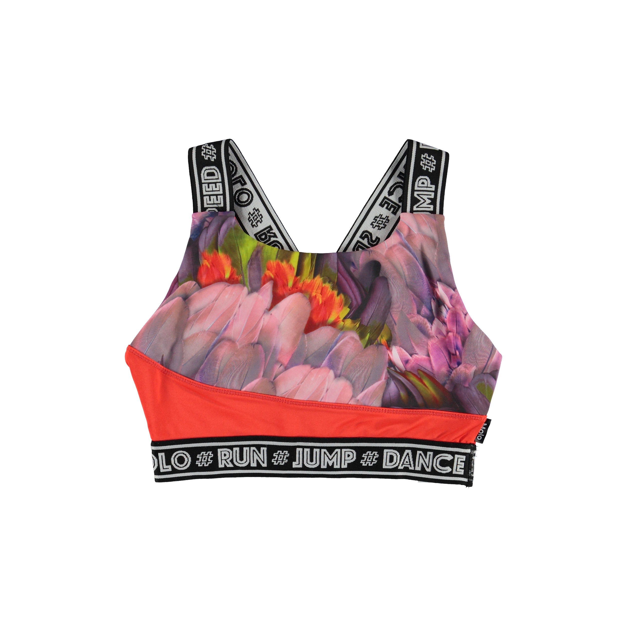 Oliva är en blommig kort topp i blå med breda axelband med text tryck. Toppen kan användas som en funktionell topp eller som en cool detalj under Molo's sportsjacka. Olivia är en del av Molo's nya sportskollektion, som bidrar till att knyta mode och sport närmare varandra. Toppen är skön och är gjord av tekniska material, vilket innebär att den kan användas både när intensiteten är hög eller när man ska slappna av. Molo’s sportkollektion är tillverkad med en unik högpresterande teknologi som heter HeiQ Smart Temp, som stöder kroppens naturliga avkylning. • Kylfunktionen aktiveras när du är varm och svettig • Kylfunktionen inaktiveras när kroppen är avkyld • HeiQ Smart Temp garanterar optimal komfort och prestanda • Testad oberoende som säkert för huden •