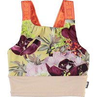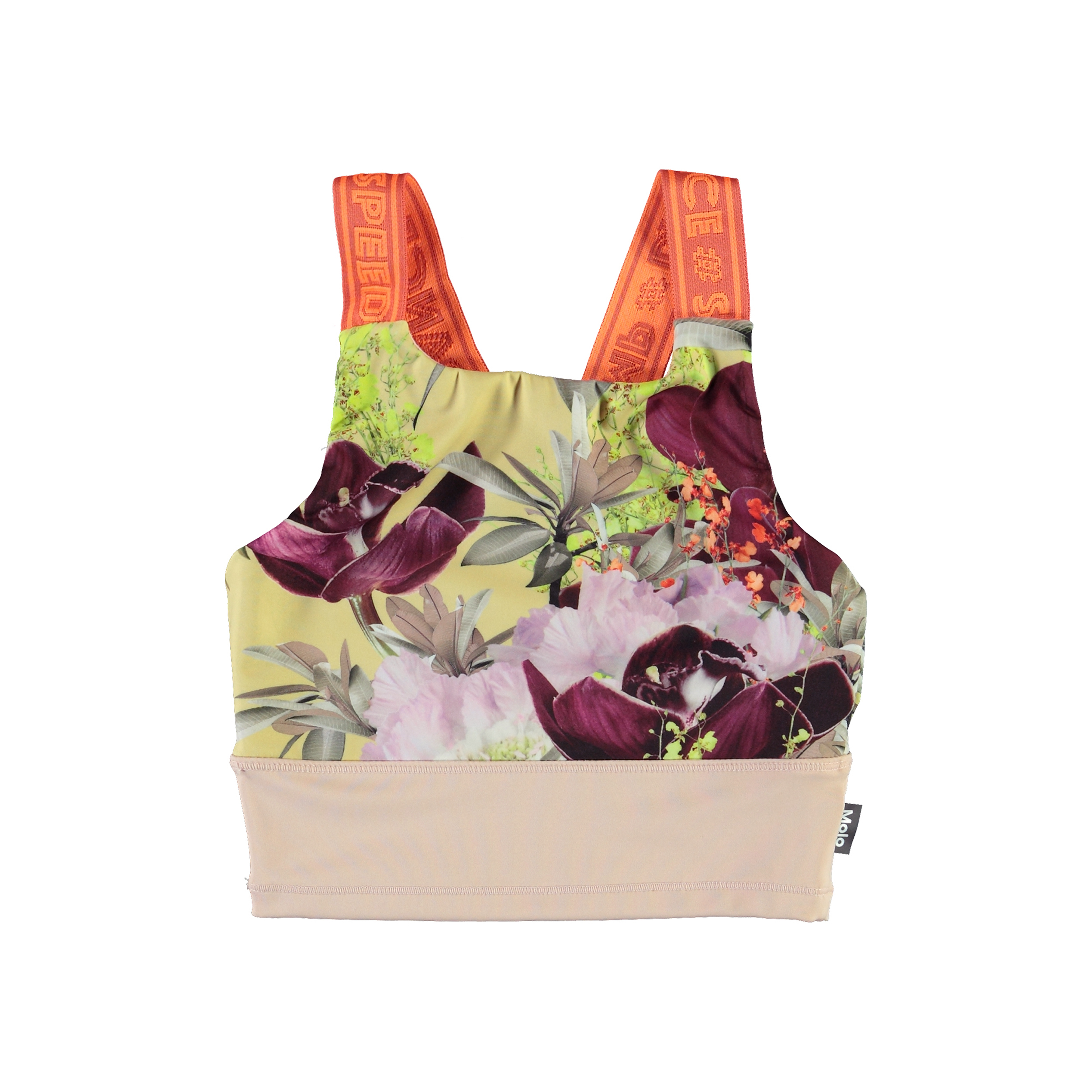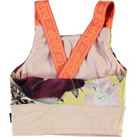 Oliva är en ljusgul och rosa sporttopp med breda orangea axelband med text. Olivia är en del av Molos sportkollektion som sammankopplar mode och sport. Toppen är väldigt bekväm och gjord av ett tekniskt material, som gör att du kan använda toppen både under hög intensitet eller när du vill slappa. Molos sportkollektion är framställt med en unik högteknologi kallad HeiQ Smart Temp, som stöder kroppens naturliga kylning. Kylfunktionen aktiveras när du är varm och svettig. Kylfunktionen inaktiveras när kroppen har svalnat. HeiQ Smart Temp garanterar optimal komfort och prestanda. Testat självständigt som säkert för huden.