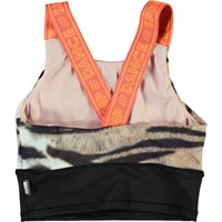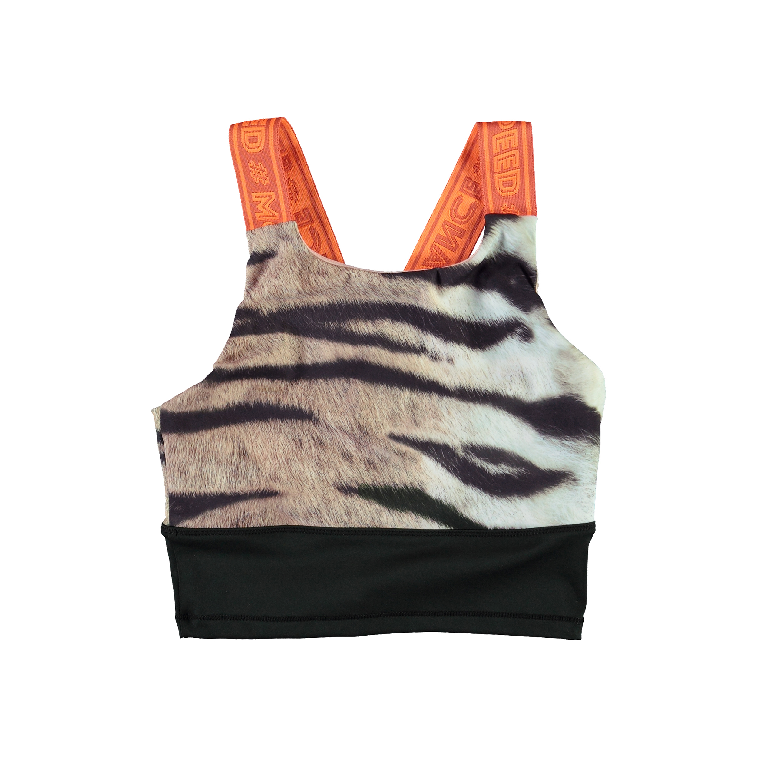 Oliva är en sporttopp med ett coolt tigermönster och svart botten. Toppen har breda orangea axelband med text. Olivia är en del av Molos sportkollektion som sammankopplar mode och sport. Toppen är väldigt bekväm och gjord av ett tekniskt material, som gör att du kan använda toppen både under hög intensitet eller när du vill slappa. Molos sportkollektion är framställt med en unik högteknologi kallad HeiQ Smart Temp, som stöder kroppens naturliga kylning. Kylfunktionen aktiveras när du är varm och svettig. Kylfunktionen inaktiveras när kroppen har svalnat. HeiQ Smart Temp garanterar optimal komfort och prestanda. Testat självständigt som säkert för huden.