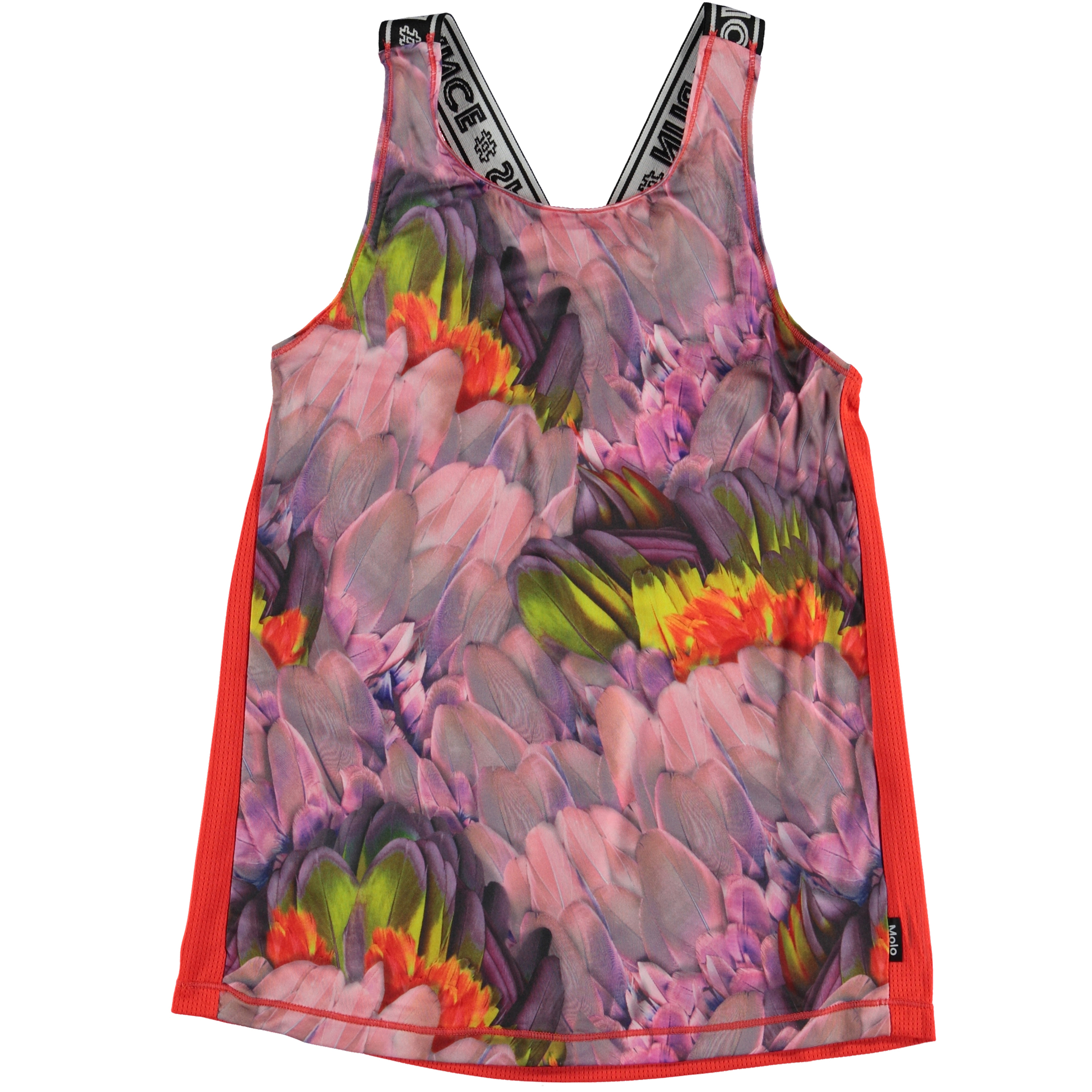 Oriana är en blå blommig topp med blå baksida och breda axelband med text. Toppen är en del av Molo's nya sportskollektion, som bidrar till att knyta mode och sport närmare varandra. Toppen är skön och är gjord av tekniska material, vilket innebär att den kan användas både när intensiteten är hög eller när man ska slappna av. Molo’s sportkollektion är tillverkad med en unik högpresterande teknologi som heter HeiQ Smart Temp, som stöder kroppens naturliga avkylning. • Kylfunktionen aktiveras när du är varm och svettig • Kylfunktionen inaktiveras när kroppen är avkyld • HeiQ Smart Temp garanterar optimal komfort och prestanda • Testad oberoende som säkert för huden •
