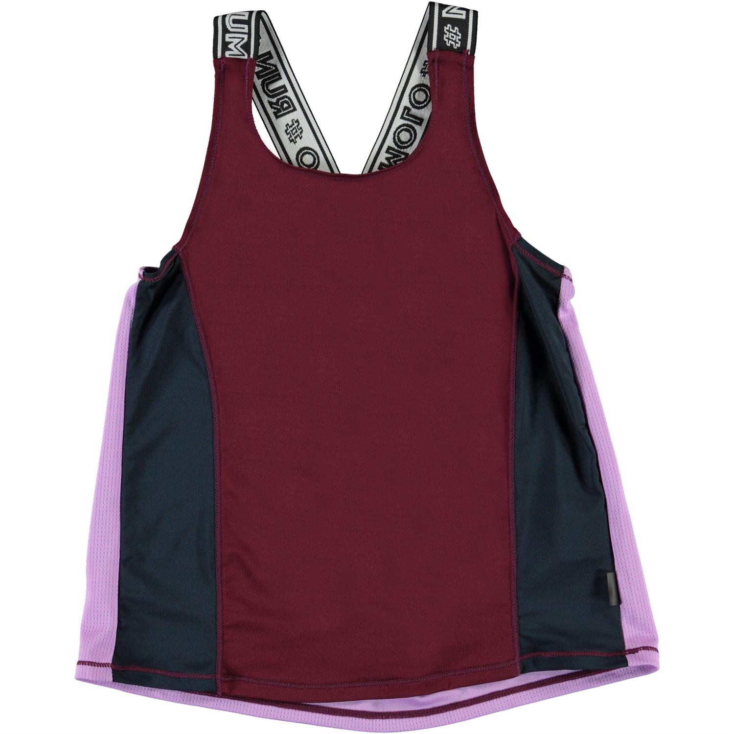 Oriana är en topp med färgblock i bordeaux, lila och blå samt breda axelremmar med text på. Oriana är en del av Molos sportkollektion som har i syfte att föra samman mode och sport. Toppen är komfortabel och är gjord av tekniska material, som gör att den kan användas både när intensitet är hög eller när det bara ska slappas. Molos sportkollektion är tillverkad med en unik högpresterande teknik som heter HeiQ Smart Temp, som stöder kroppens naturliga kylning. Kylfunktionen aktiveras när du är varm och svettig. Kylfunktionen inaktiveras när kroppen har svalnat. HeiQ Smart Temp garanterar optimal komfort och prestanda.