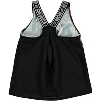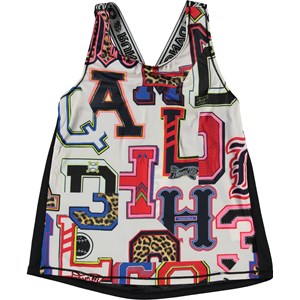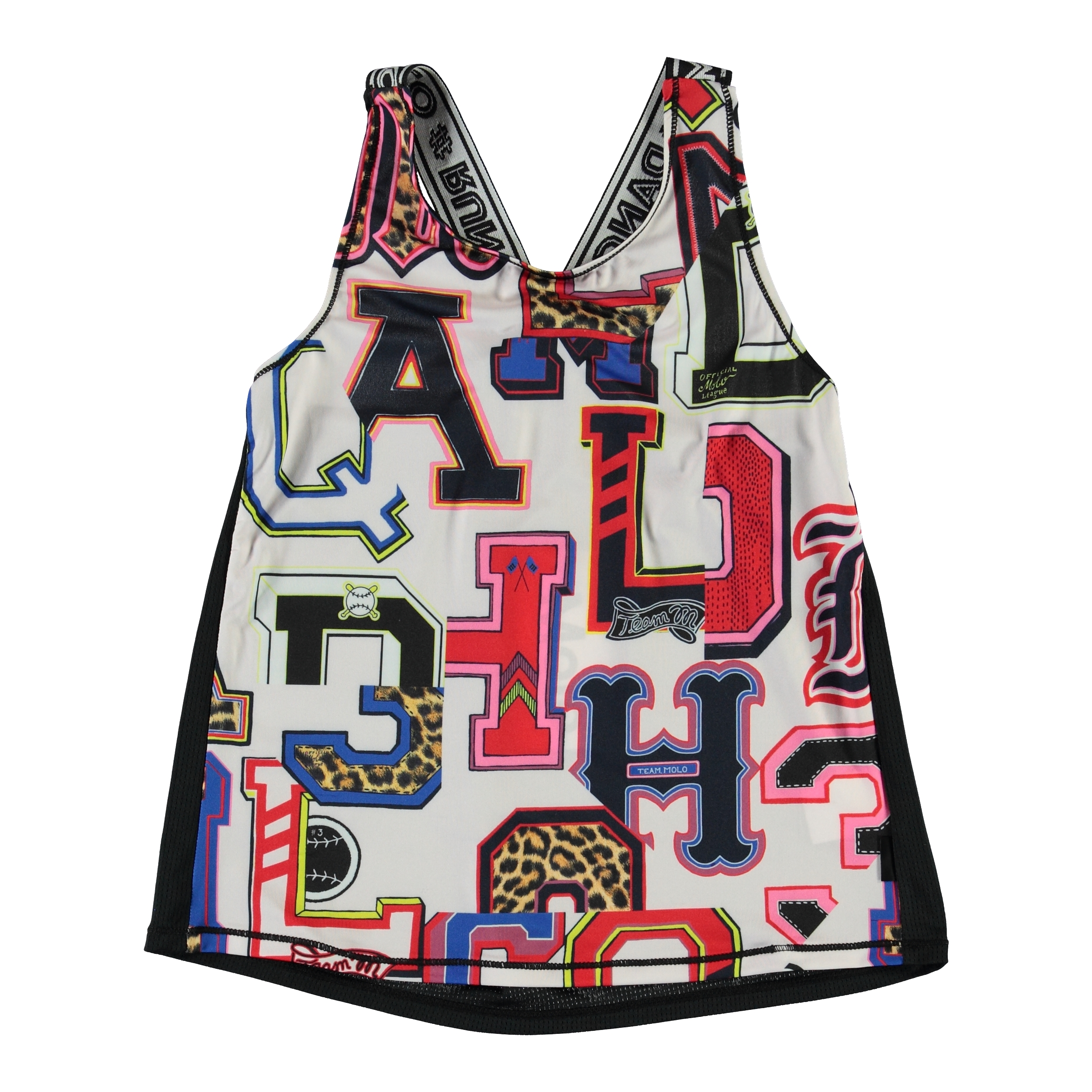 Oriana är en sportstop med tryck av grafiska bokstäver fram och med en svart baksida, samt breda axelband med text. Toppen är en del av Molo's sportskollektion, som kombinerar mode och sport. Toppen är skön och är tillverkad av tekniska material som kan användas både när intensiteten är hög eller bara för att koppla av. Molo’s sportskollektion är tillverkad med en unik högpresterande teknologi som heter HeiQ Smart Temp, som stöder kroppens naturliga avkylning. Kylfunktionen aktiveras när du är varm och svettig. Kylfunktionen inaktiveras när kroppen är avkyld. HeiQ Smart Temp garanterar optimal komfort och prestanda. Testad oberoende som säkert för huden.