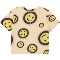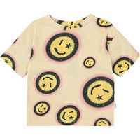 Rabecke är en ljusgul t-shirt med smileys som har stjärnor för det ena ögat.