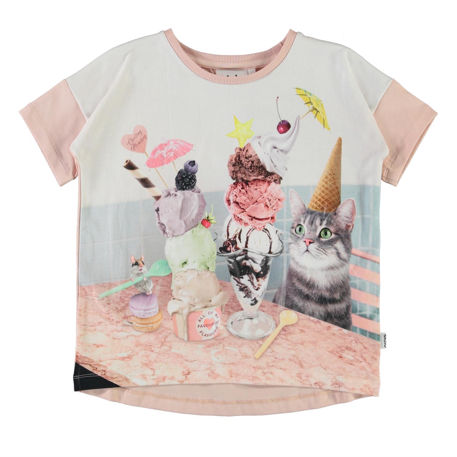 Raeesa är en t-shirt med en oversized passform och ett humoristiskt tryck av en katt med en glasstrut på huvudet. T-shirten har en rosa rygg.