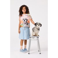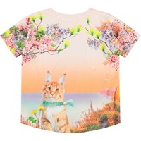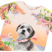 Ljusorange t-shirt i mjuk ekologisk bomull med en rund halsringning, en lös passform och en längre längd på baksidan än framsidan. T-shirten har ett mönster framtill av kontorets söta hund Maggie och färgglada blommor, samt en röd söt katt på baksidan och det blåa havet.