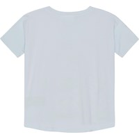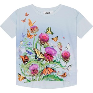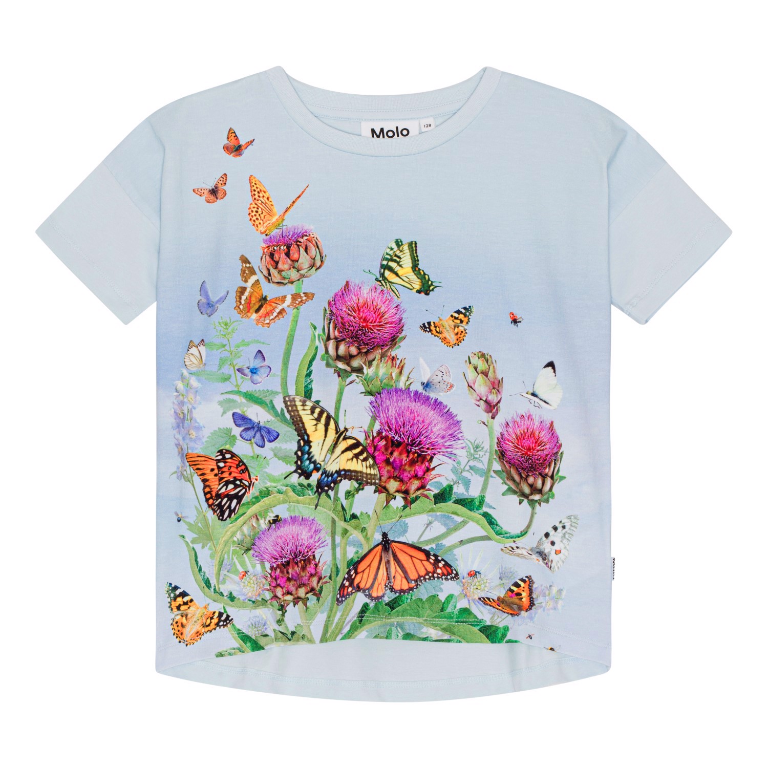 Ljusblå t-shirt i ekologisk bomull med nyckelpigor, fjärilar, humlor och kronärtskocksblommor framtill. T-shirten har en lös passform, rund hals och är något längre baktill.
