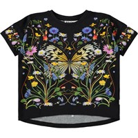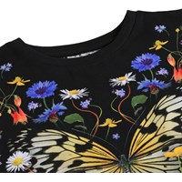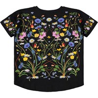 Svart T-shirt i mjuk, ekologisk bomull med rund hals och T-shirtärmar som faller lätt över axlarna. T-shirten har en lös passform, är längre bak och har ett färgglatt blommönster.