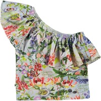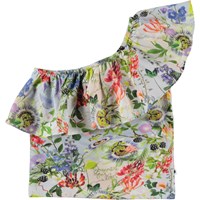 Raelyn är en kort asymetrisk toppmed ett axelband och stor volangkant. Toppen är ljusblå med blommigt mönster.