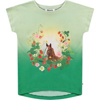 Stretchig ljusgrön och mörkgrön T-shirt i ekologisk bomull. T-shirten har en normal passform, korta ärmar, ribbad halsringning och är längre baktill än framtill. Den har ett mönster av en ponny omgiven av färska jordgubbsplantor.