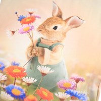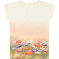 Ljusorange T-shirt med korta ärmar i ekologisk bomull med en främre bild av en kanin i en färgglad blomsteräng. T-shirten har en normal passform, små korta ärmar, en ribbad halsringning och är längre baktill än framtill.