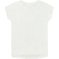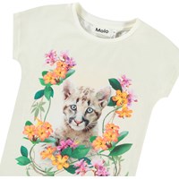 Stretchig off-white t-shirt i ekologisk bomull. T-shirten har en vanlig passform, små korta ärmar, ribbad halsringning och är längre bak än fram. Den har en bild av en baby puma omgiven av färgglada blommor framtill.