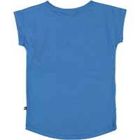 Ragnhilde är en blå t-shirt med en palettblomma på bröstet. T-shirten är längre baktill.