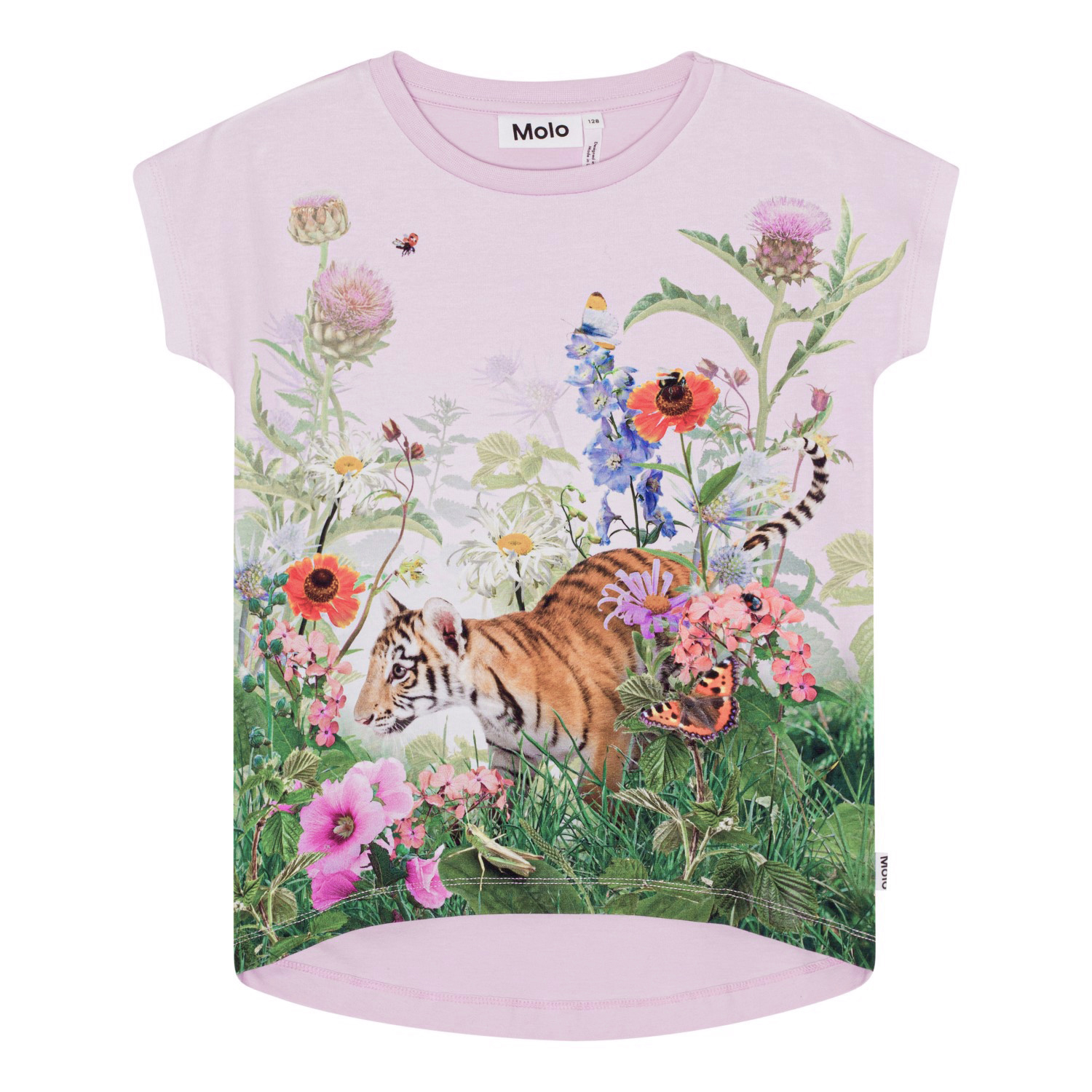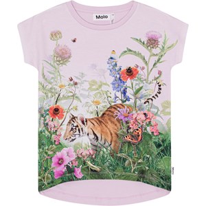 Pastell lila ekologisk bomulls t-shirt med korta ärmar. T-shirten har en bra passform och är lite längre baktill. Framtill är det en tigerunge i en färgrik blomsteräng.