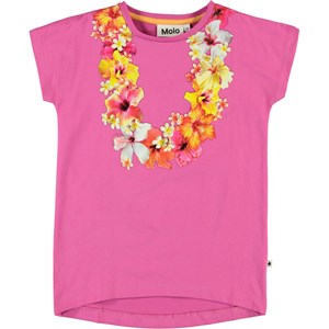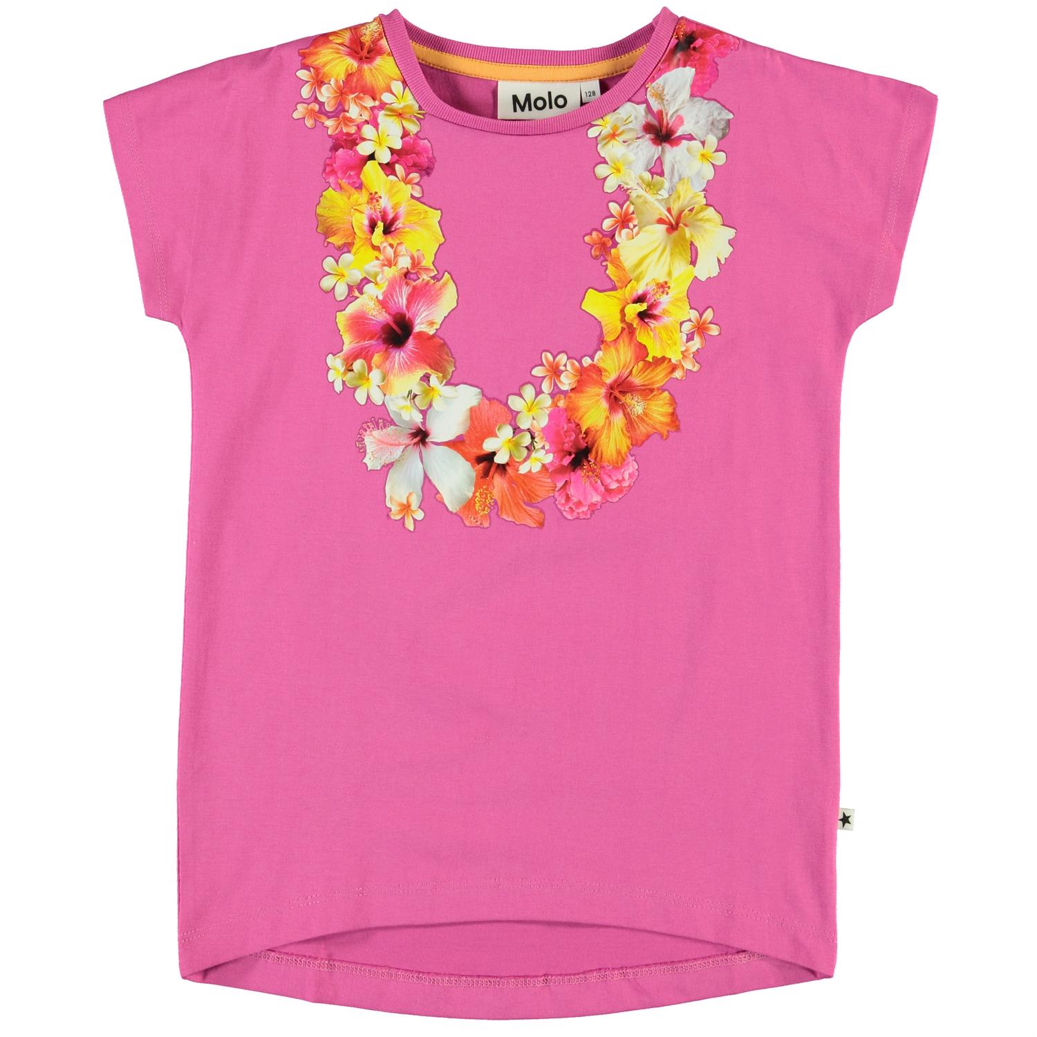 Ragnhilde är en rosa t-shirt med en blomkranstryck runt halsen. T-shirten är i 100% bomull och har uppvikta ärmar.