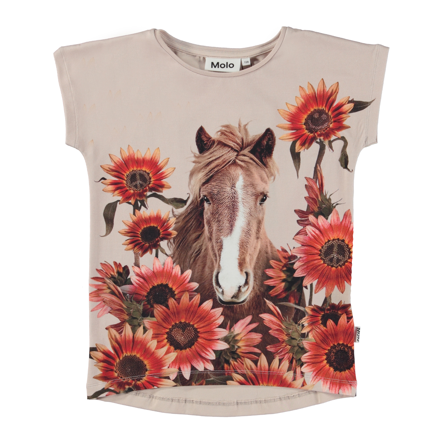 Rosa t-shirt med en söt ponny som står bland stora röda blommor. Denna t-shirt är tillverkad i 100% bomull, har korta ärmar, rund hals med ribb och en normal passform.